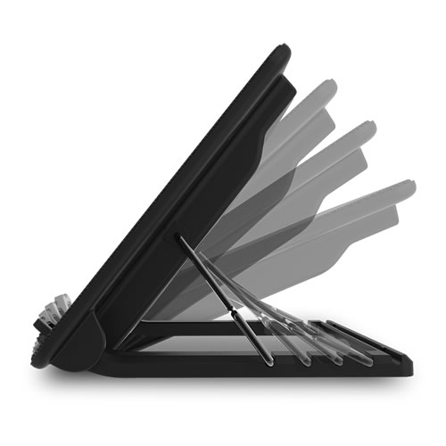 Um ventilador silencioso de 140 mm com design aerodinâmico mantém o seu portátil fresco e a funcionar sem problemas. 5 ajustes de altura ergonómicos para ângulos de visão confortáveis. 4 portas USB adicionais permitem que ligue todos os seus dispositivos.